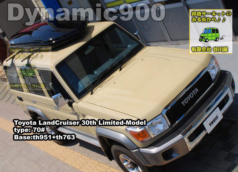 トヨタ ランクル限定30thアニバーサリーモデルのクルマに、THULEスクエアバーのベースキャリアセットを取付し、その上に、ルーフボックス:THULE Dynamic900Blackを取付した事例の紹介です。